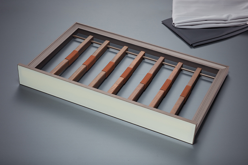 皮革包覆精选铝合金垂挂式裤挂架,易于取放且有效避免裤装褶皱,为娇贵裤装提供至尊呵护。